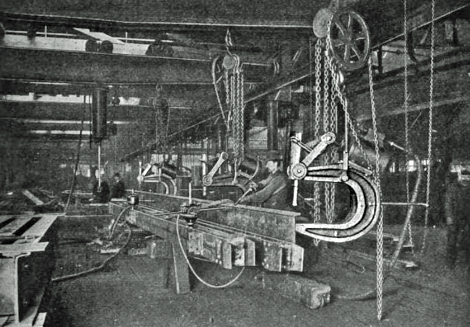 Over the years, the focus of the written history of the Golden Gate Bridge was on the spectacular erection of the 70,000-ton towers and the spinning of wires across the Golden Gate. The words “field driven” were soon dropped from the phrase “field driven rivets” in the written record. Each 70,000-ton tower is now commonly recorded as being held together with 600,000 rivets. Actually, if the towers only had 600,000 rivets, they probably would fall down. New York’s George Washington Bridge has an estimated ten million (10,000,000) shop- and field-driven rivets, Michigan’s Mackinac Bridge an estimated five million (5,000,000) shop- and field-driven rivets. Vast walls of rivets can be seen inside and outside the Golden Gate Bridge towers in rare fabrication shop photographs, rivets driven in nearly every square foot of these massive steel towers. Shop rivets were driven with large pneumatic riveters operated by shop craftsmen, their history rarely recorded, their story and industrial tools rarely exhibited in museums.