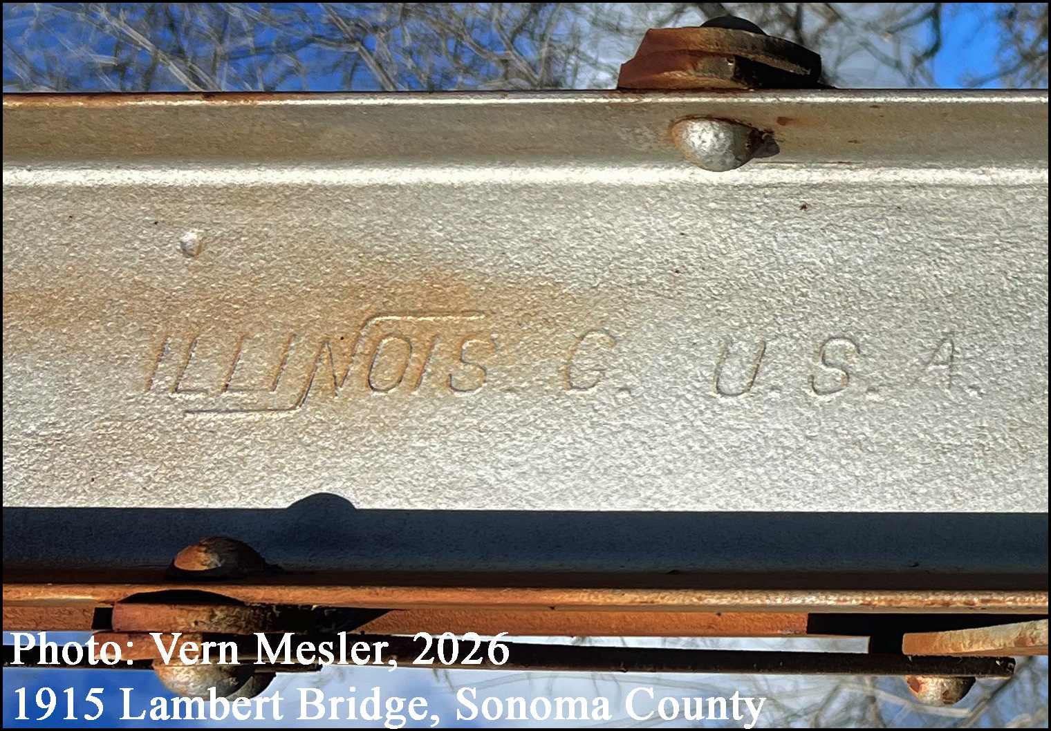 Lambert Bridge (and all the historic bridges on our cousins’ list of historic bridges) are pin-connected truss bridges. These pins are specially designed bridge pins that I consider one of the most historically significant features of a historic metal truss bridge. These bridge pins are more than a simple threaded pin and nut, and the function of a bridge pin and the accompanying nut is more complex than might appear when first observed. The reason for the distinctive shape of the nut was made clear from a book I purchased at an antique store many years ago, an 1896/1897 Home Study Course that explained the function of what are called recessed nuts, a combination of nut and washer in one piece: “Recessed nuts are used upon chord pins in pin connected bridges, in order that a perfect bearing may be afforded for each member connected upon them.” Visit my website for the full text from the Home Study section on Chord Pins